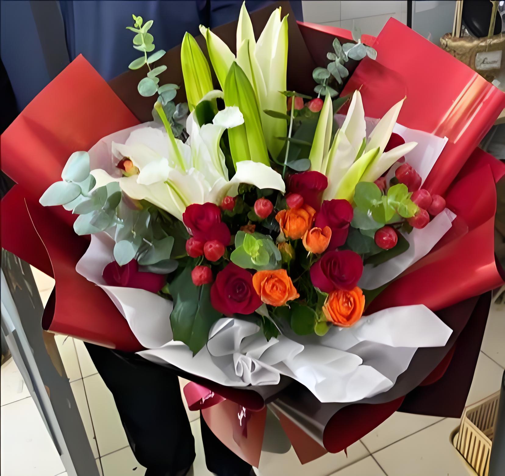 丽江华坪县花店包11枝红玫瑰、2枝多头白百合、6枝橙色多头玫瑰、红豆、尤加利叶